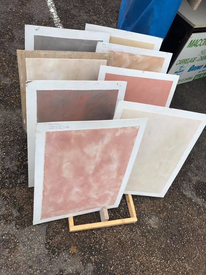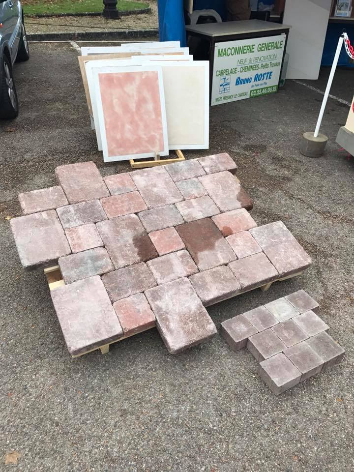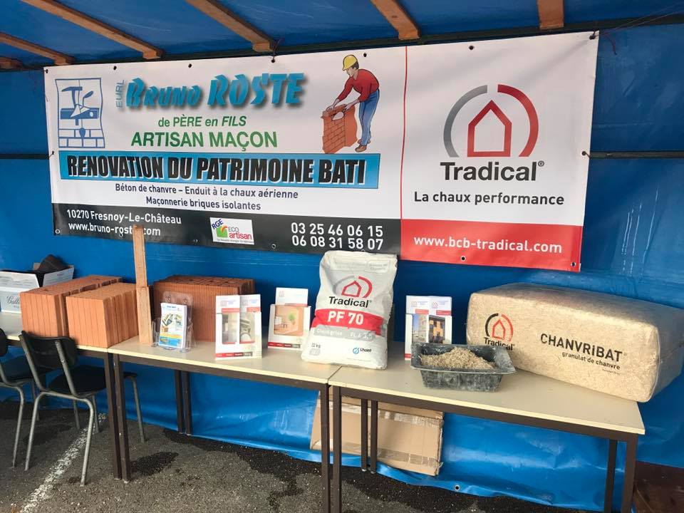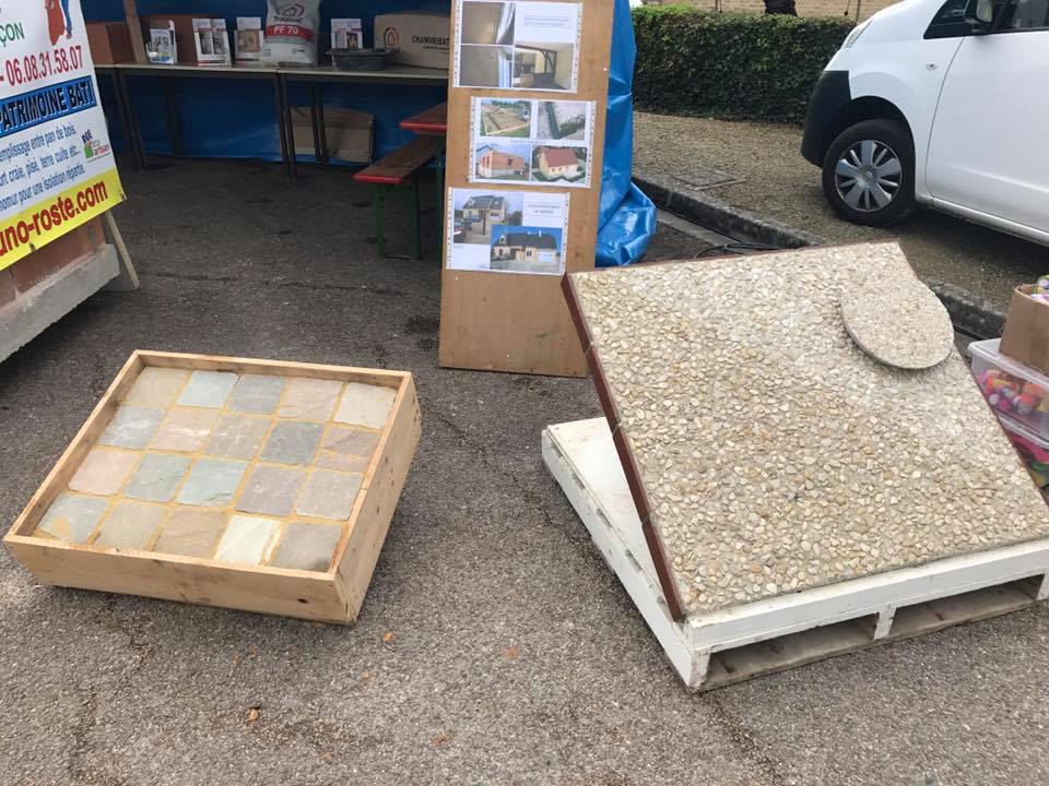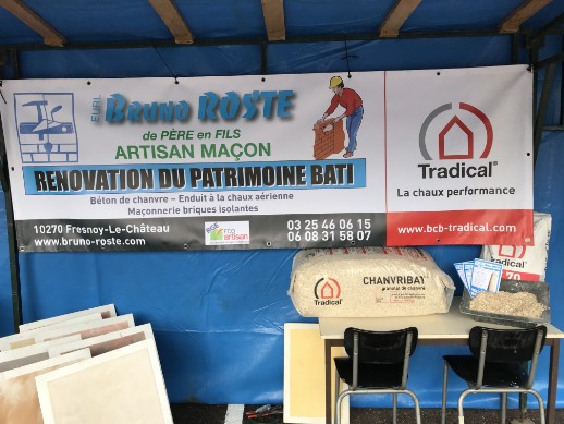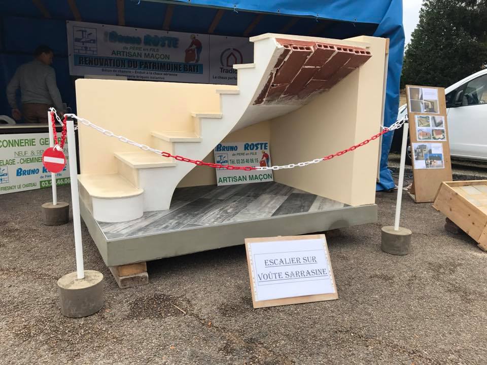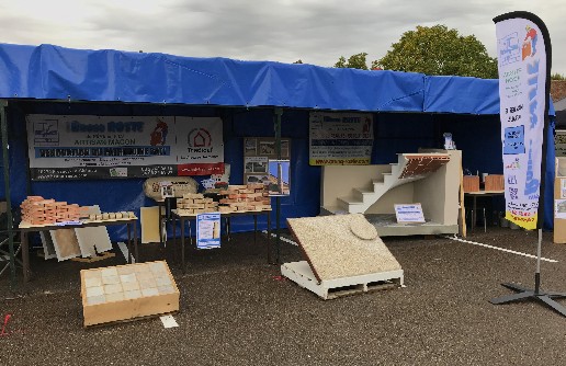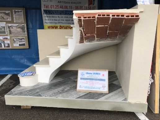 Nous y avons exposé, comme le montre les photos ci-dessous, une maquette d'escalier sur voûte sarrasine, différents modèles de pavage, enduits Stuc à la chaux, béton de chanvre chaux, brique isolantes, etc...